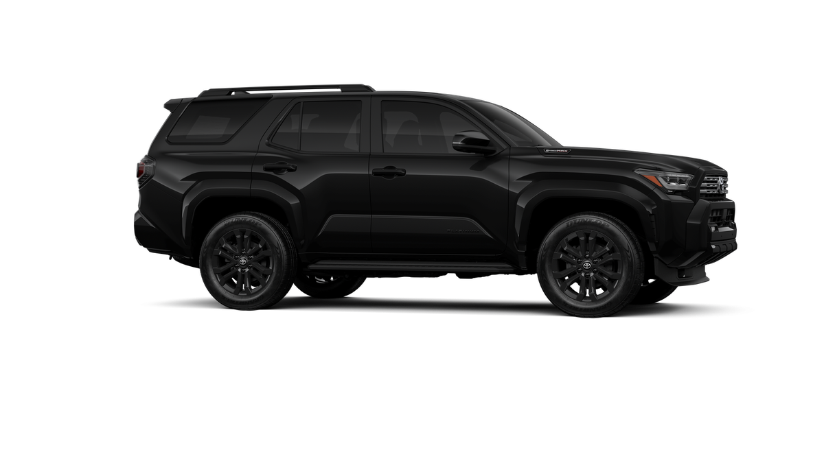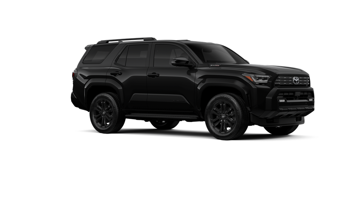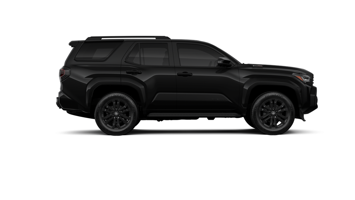 - Dark-chrome tri-bar grille; gloss-black mirror caps and door handles; color-keyed overfenders and rear spoiler; gloss-black "PLATINUM" and "4RUNNER" badges