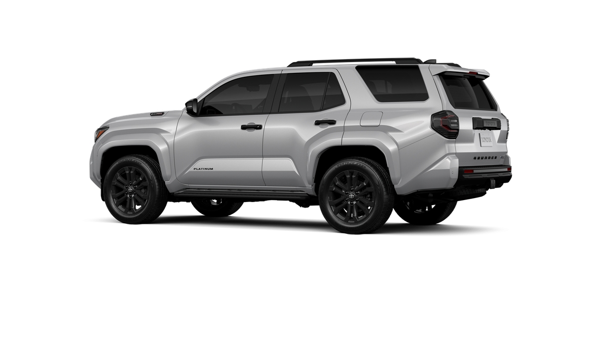 - Dark-chrome tri-bar grille; gloss-black mirror caps and door handles; color-keyed overfenders and rear spoiler; gloss-black "PLATINUM" and "4RUNNER" badges