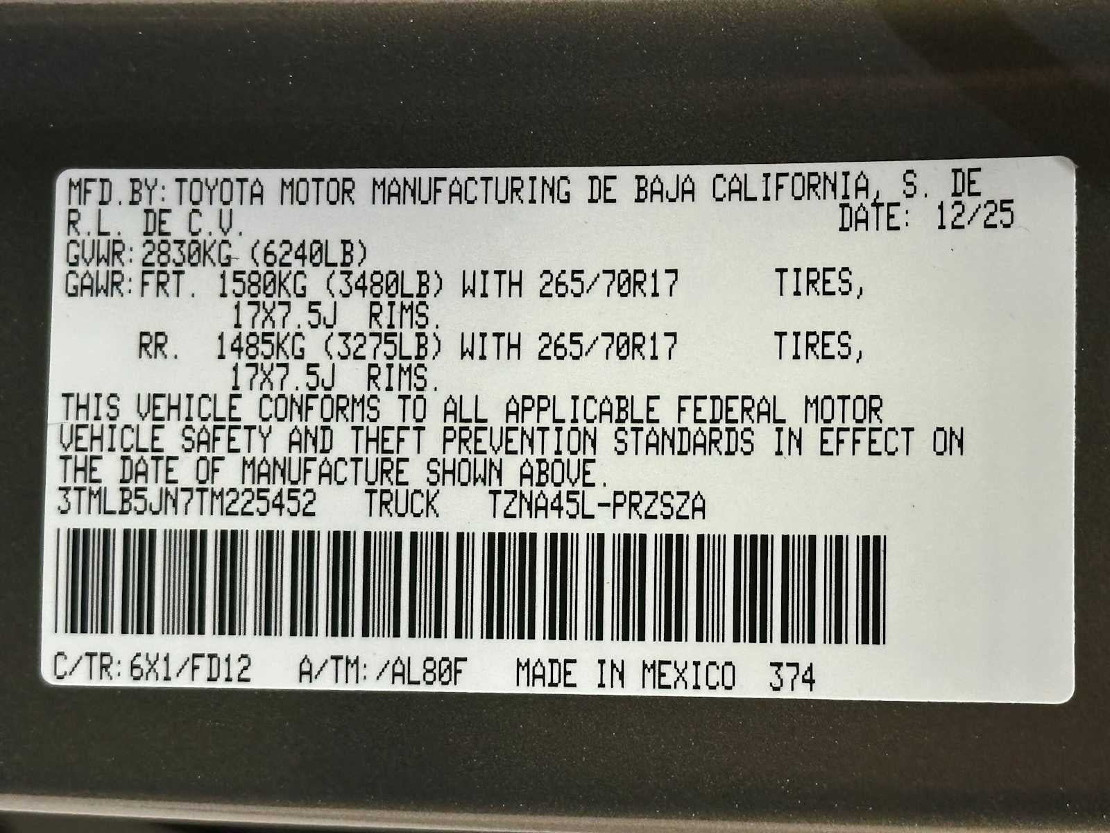 - Front Tire Size: P265/70TR17